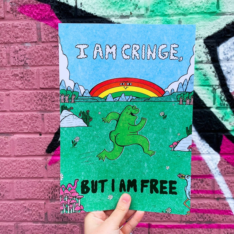 I'll be the first to admit, I am made of 100% cringe. And that's a fantastic thing! This print celebrates being cringe and happy, and you could be just like this chipper frog running into the beautiful rainbow without a single care in the world.