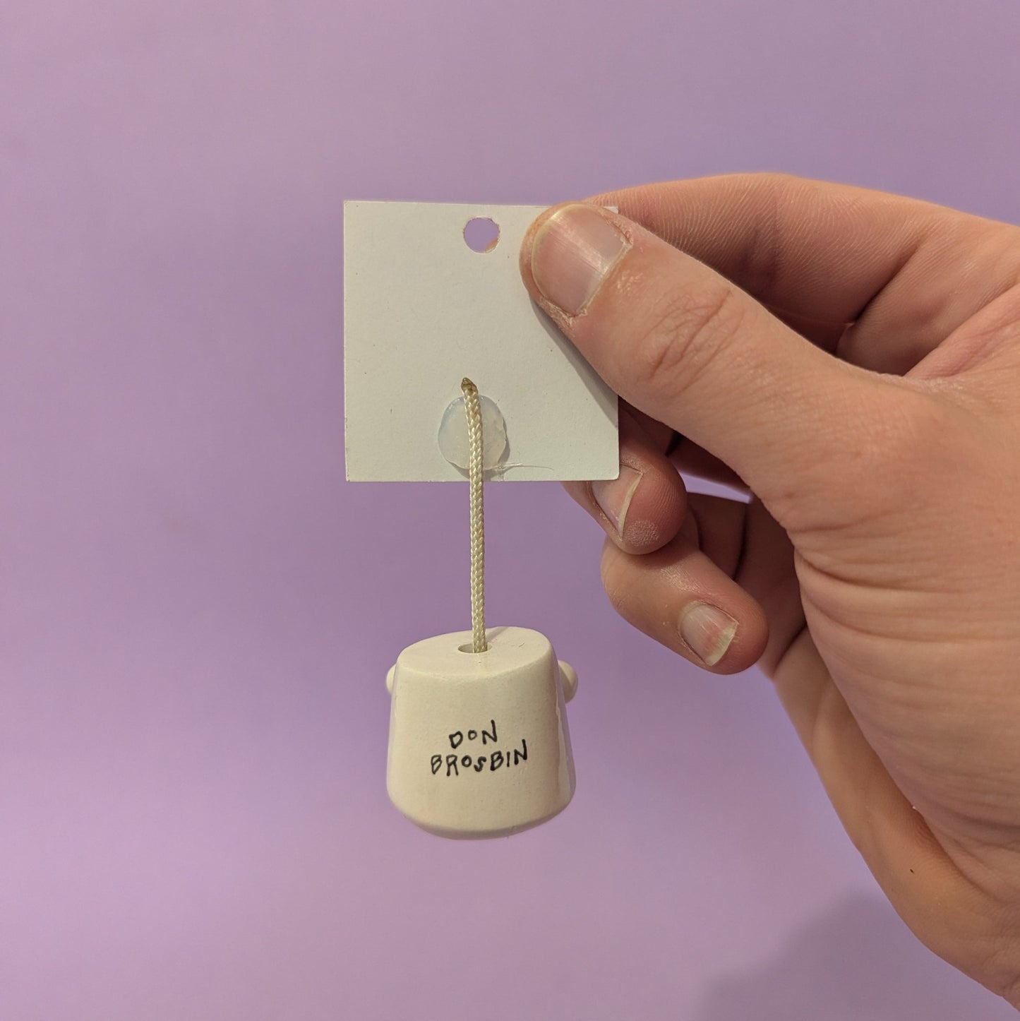 Handmade ceramic light pull with googly eyes and a yellow beak.