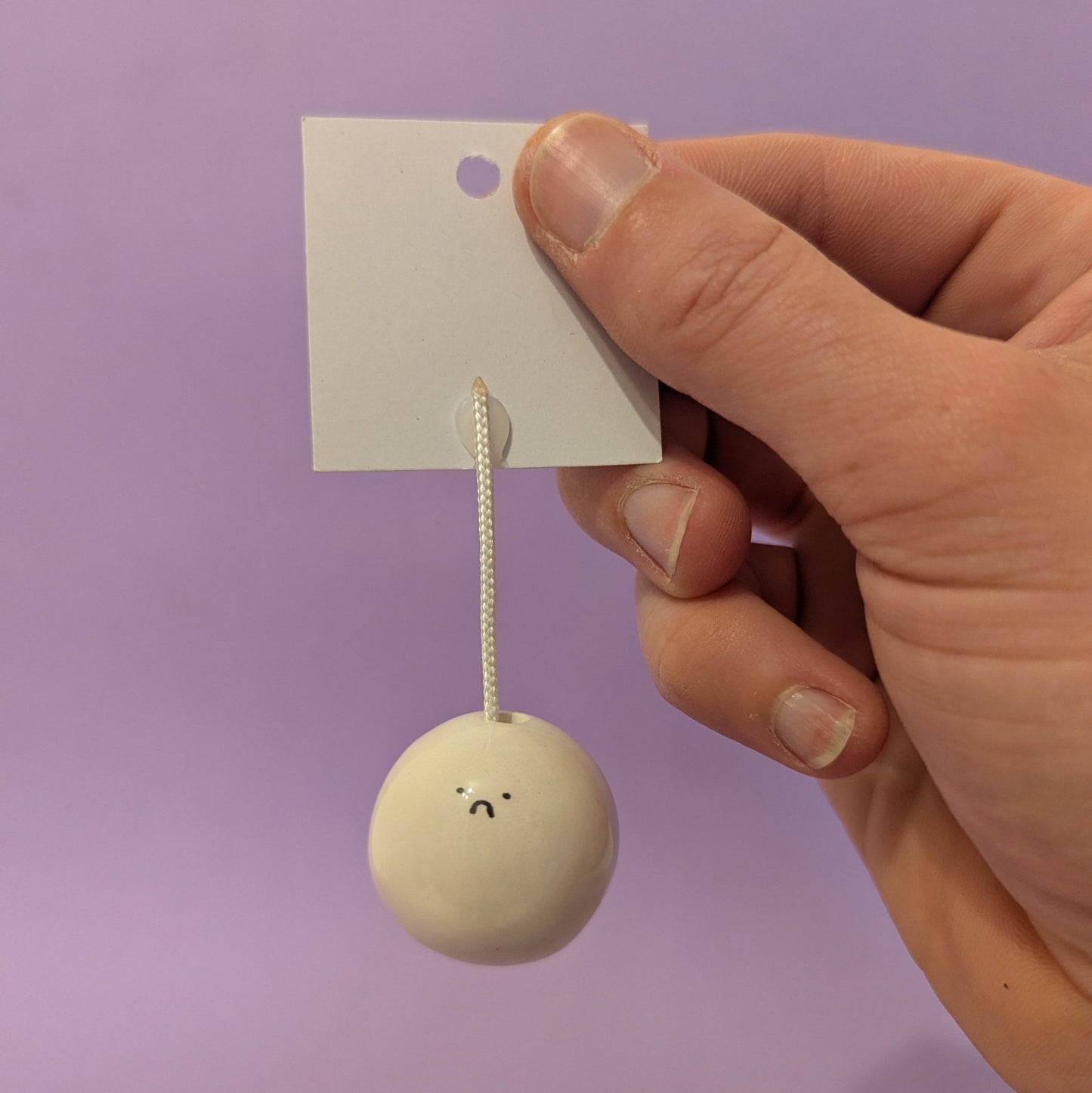 Handmade ceramic light pull with a happy face one one side, a sad face on the other.