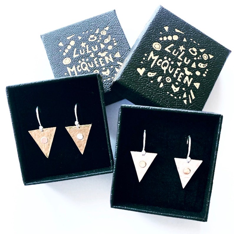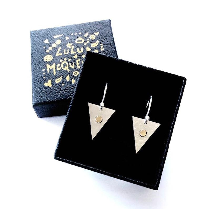 They are available in 2 finishes: sterling silver triangle with brass disc or brass triangle with silver disc.