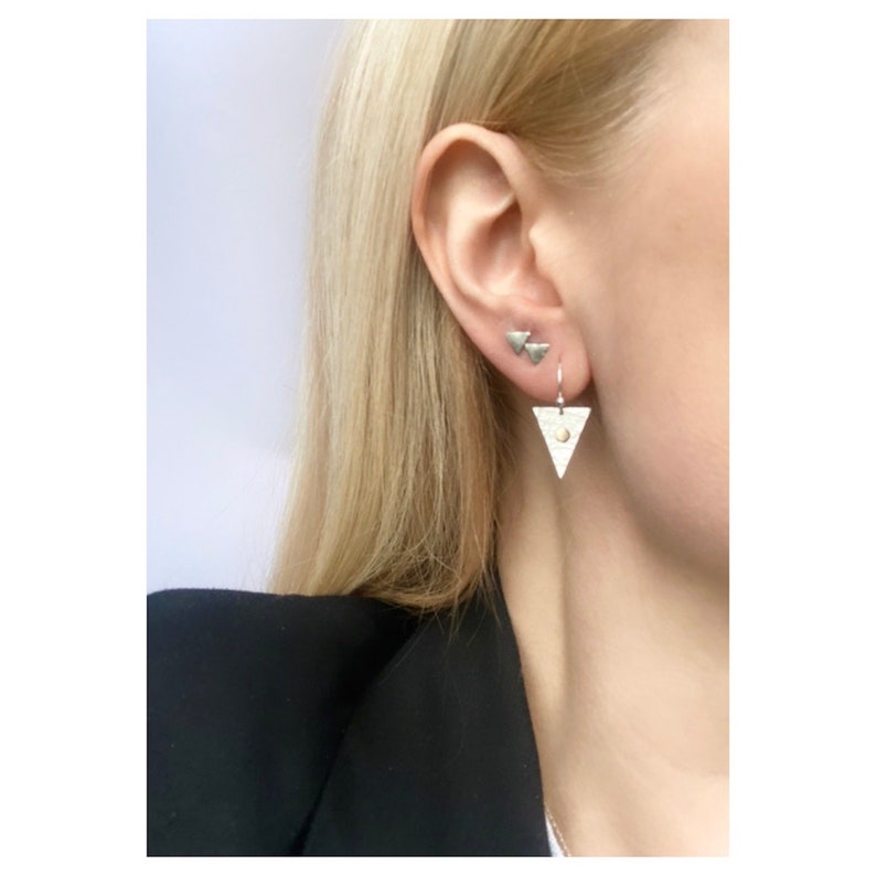 These modern triangle dangle earrings have been hammered to give them a unique finish and have a contrasting disc design.