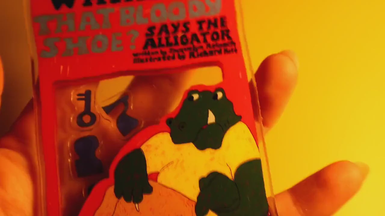 Thick, portrait orientated keyring that resembles a shape of a book. The design is supposed to be a parody of 1970's book of Who stole Alligators shoe? from the Sweet Pickle's Series, which contains blue shoe shapes and a key inside the keyring that you are able to shake. In order to get the shapes to move, some vigorous shakes would be enough to get them going. On both sides, each keyring has protective film to prevent from scratches and smears (seen on 4th picture ) you are able to peel off.